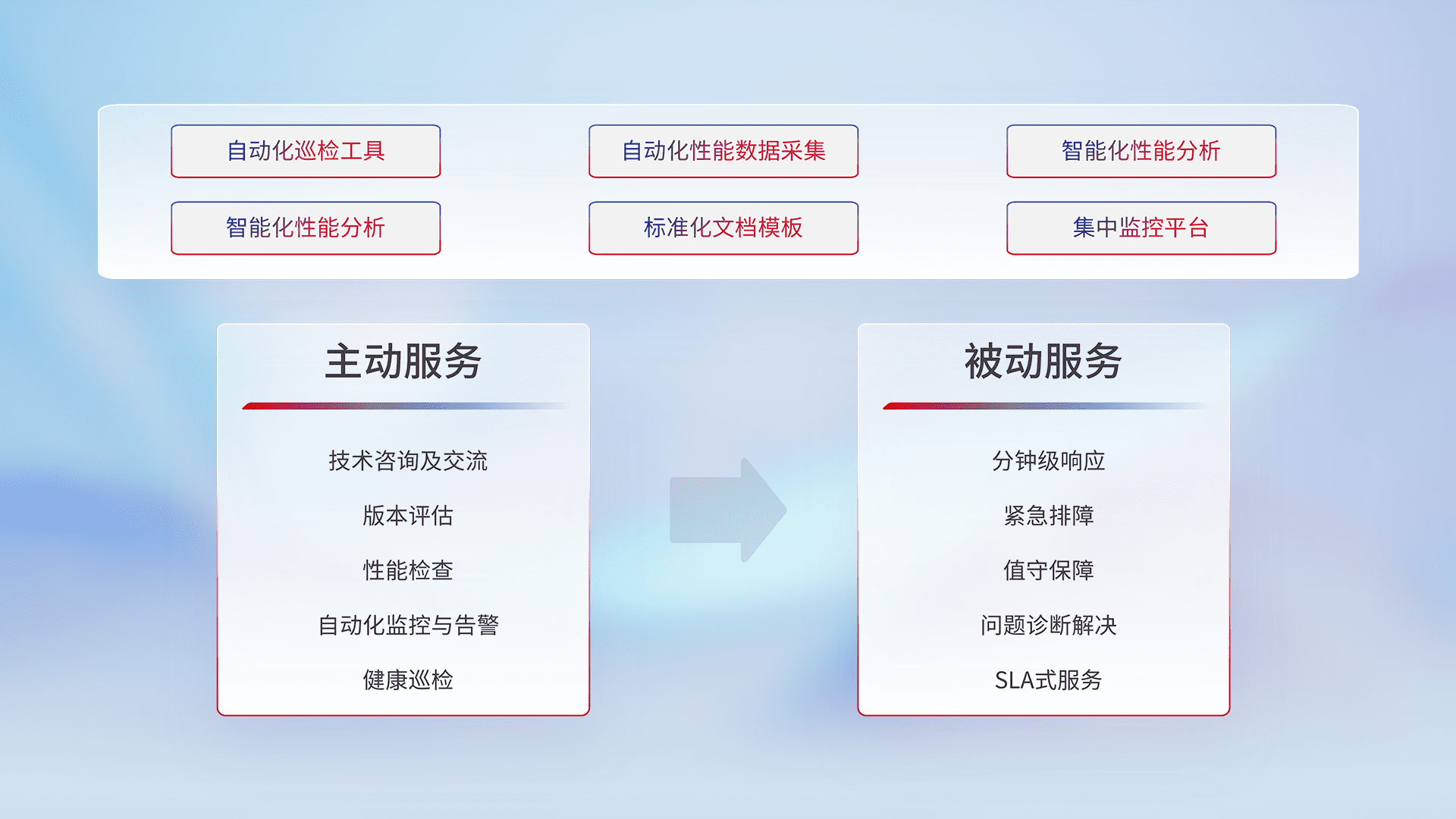 智能化工具和标准化文档,,,保障服务质量,,提供主动服务(包含技术咨询、、、、版本评估、、、性能检查、、、、自动化监控与告警、、、健康巡检)和被动服务包含(分钟级响应、、、紧急排障、、值守保障、、问题诊断解决、、SLA服务)。。。