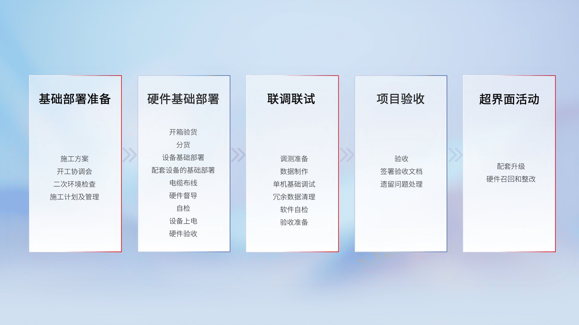 从基础部署准备、、、、硬件基础部署、、、、联调联试、、、项目验收、、越界面活动的全过程可追溯,,,保证施工质量和进度。。